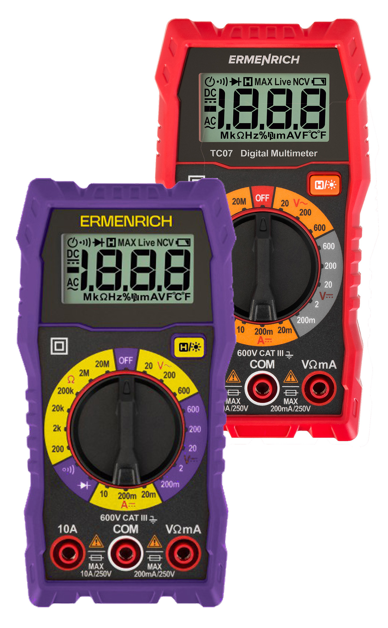 El multímetro digital Ermenrich Zing TC07 provisto de un conmutador giratorio clásico está diseñado para medir voltaje de CC y de CA, corriente de CC y resistencia eléctrica. Su funcionalidad es suficiente para un uso doméstico y también para realizar mediciones básicas con fines profesionales.