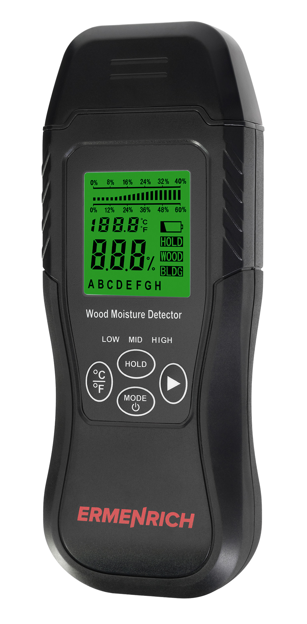 El detector de humedad portátil Ermenrich Wett MW30 (medidor de humedad) le permite medir rápidamente el contenido de humedad de los materiales de construcción y productos de madera. Esto es especialmente útil para la adquisición de materiales, la fabricación, la carpintería y el mantenimiento del hogar. El dispositivo puede trabajar en materiales tales como cartón, madera de construcción, hormigón, yeso, etc. Tiene un termómetro integrado que puede medir la temperatura en dos unidades de medida: Celsius y Fahrenheit.