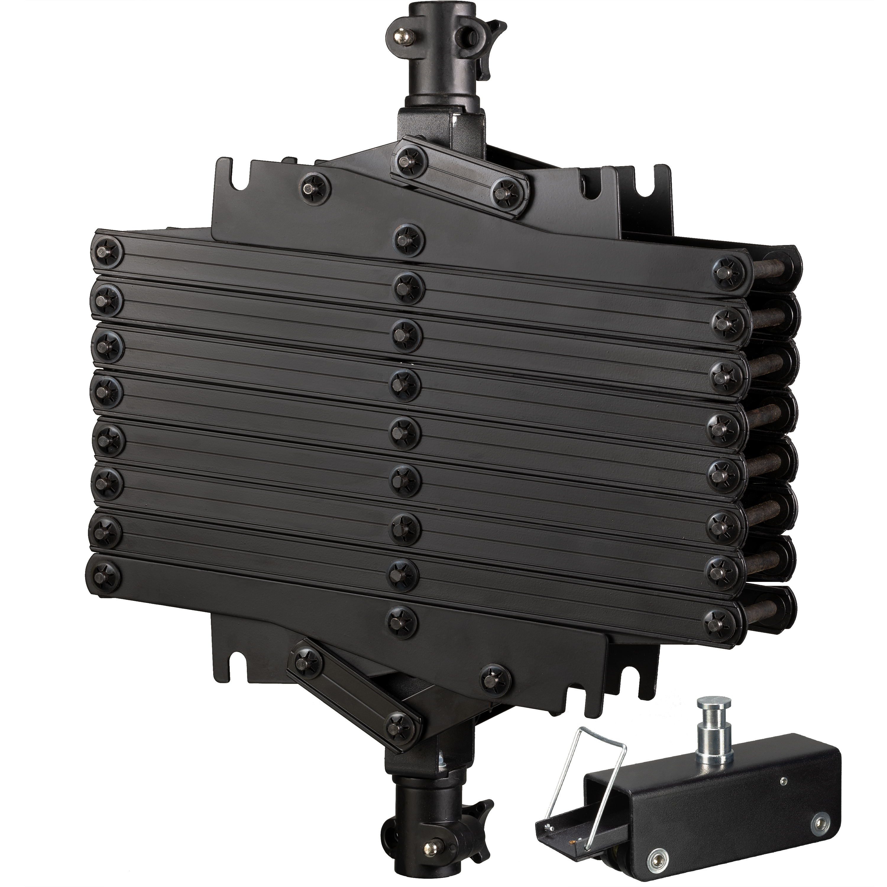 El equipo de estudio fotográfico, los flashes de estudio fotográfico, las lámparas de luz diurna de estudio fotográfico y también las luces LED y las luces de área se fijan al pantógrafo con un rango de extensión de 40 - 200 cm utilizando el adaptador de espiga incluido en el incluye. Un carro para montaje en el sistema de raíles del techo o en raíles individuales, así como un cable de seguridad y guías para cables garantizan un flujo de trabajo sin problemas.
