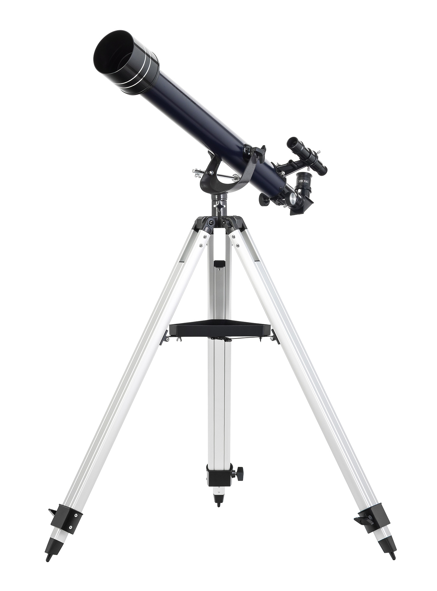 El tubo óptico está montado en una montura altazimutal AZ2. Es un sistema muy intuitivo: basta con mover el tubo hacia arriba y hacia abajo o de lado a lado con la mano. Los tornillos de bloqueo permiten fijar el telescopio en su sitio una vez que se ha encontrado el objetivo. El trípode está fabricado en aluminio ligero pero resistente. Se puede ajustar la altura del trípode para adaptarlo al observador, lo que resulta especialmente práctico cuando el telescopio lo comparten tanto adultos como niños. La bandeja para accesorios mantiene todos los accesorios al alcance de la mano.