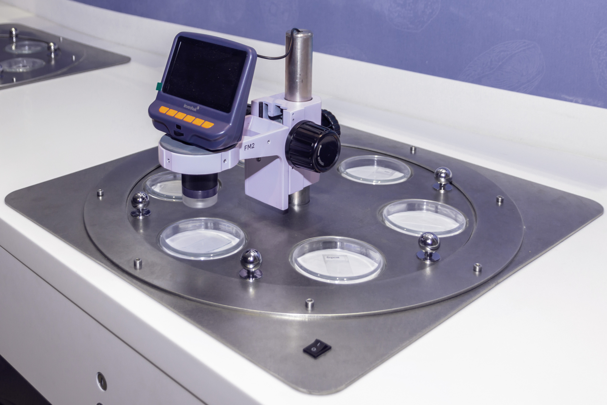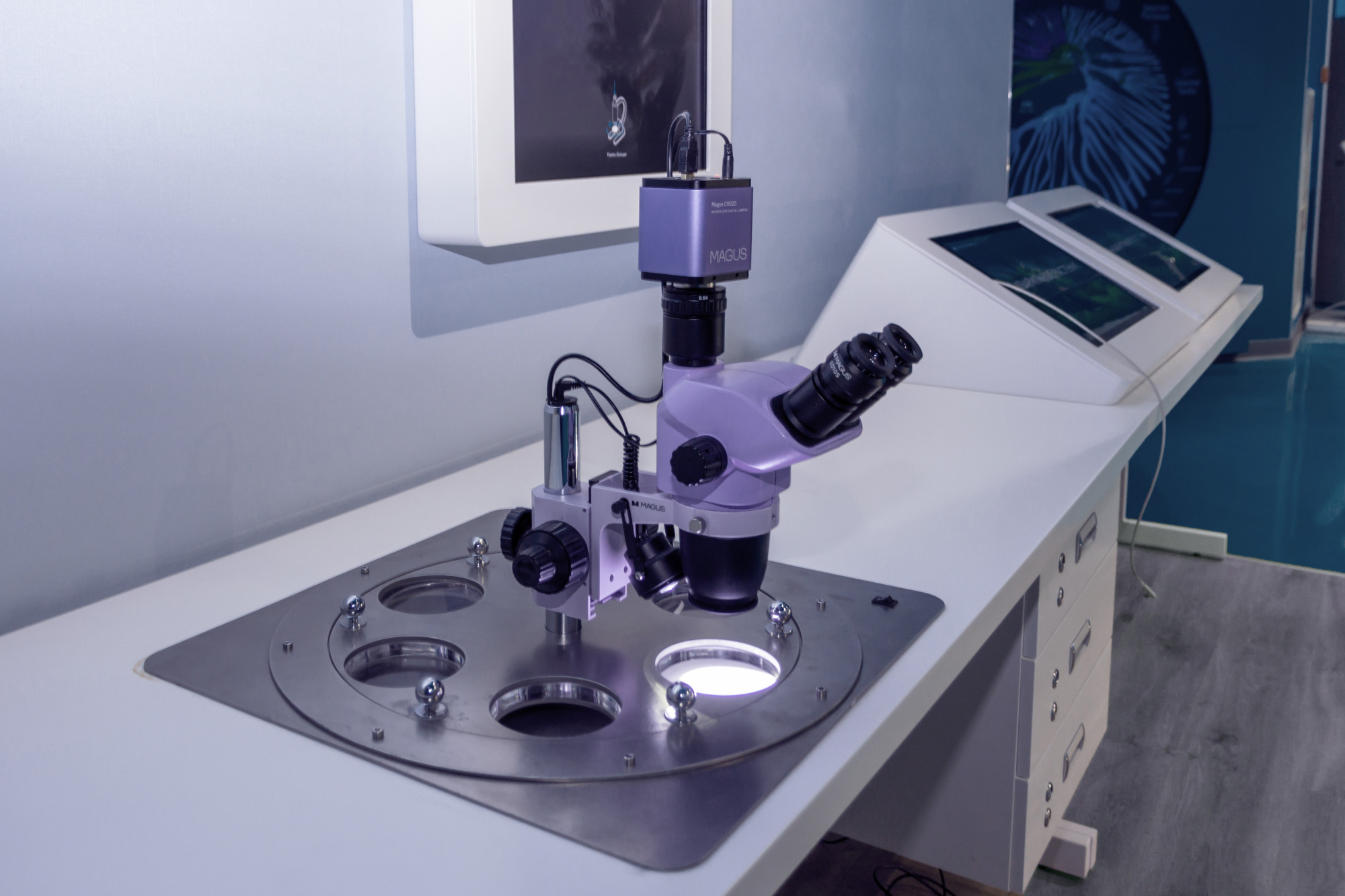 Las estaciones de investigación están equipadas con microscopios estereoscópicos, cámaras digitales y pantallas. Gracias a este diseño, todos los visitantes pueden utilizar el microscopio, cambiar la muestra de forma independiente y ver muestras de tejidos y microorganismos en una pantalla grande.